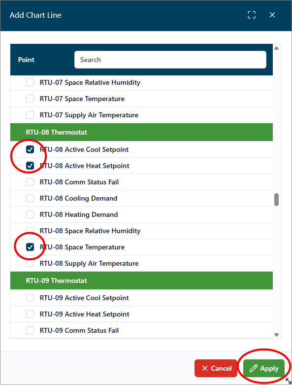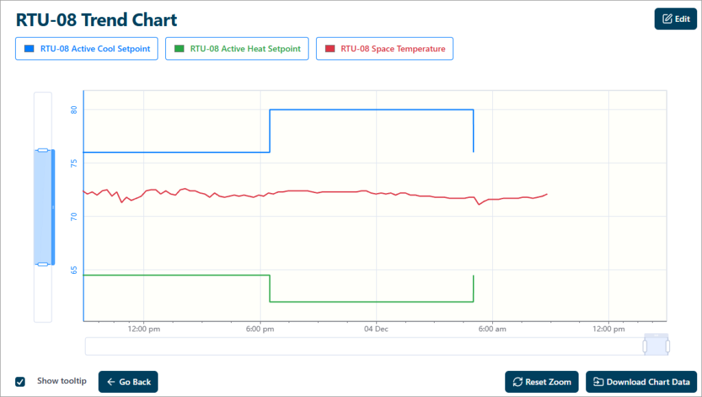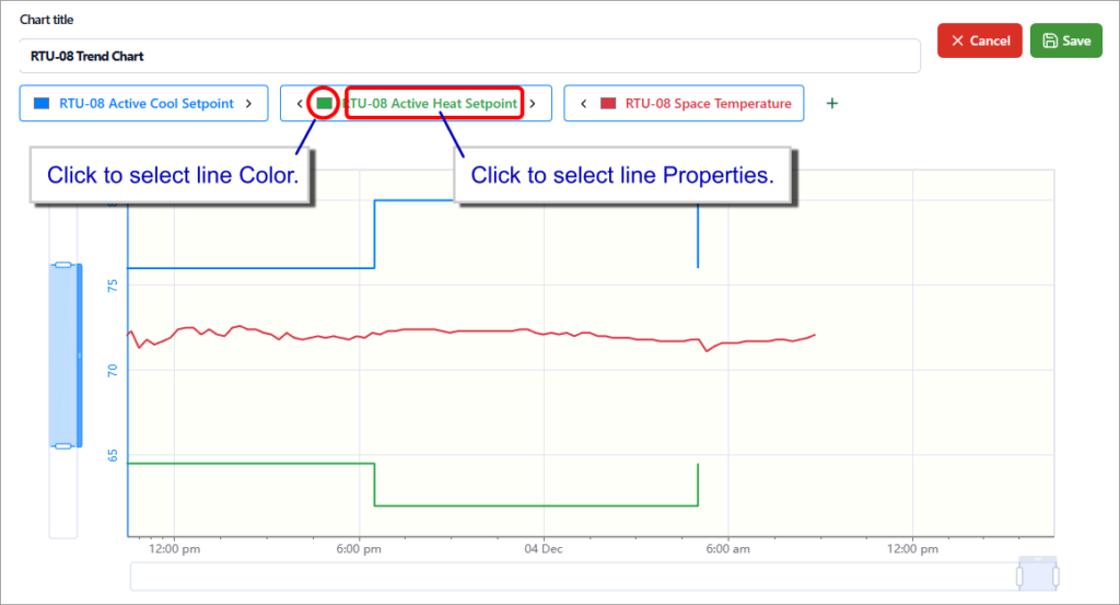 Trend Charts offer the ability to record and view how your point values change over time. The default “All Points View” provides a link for each point that displays the selected, single point chart.